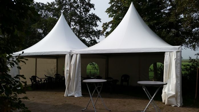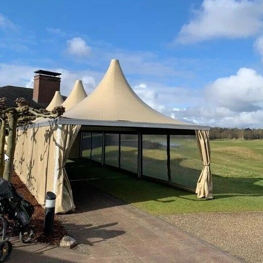 Deze stijlvolle tent is een markante verschijning, met dank aan haar karakteristieke puntdak. Een groot voordeel van de Pagodetent is dat de tent makkelijk te koppelen is aan onze andere tenten.