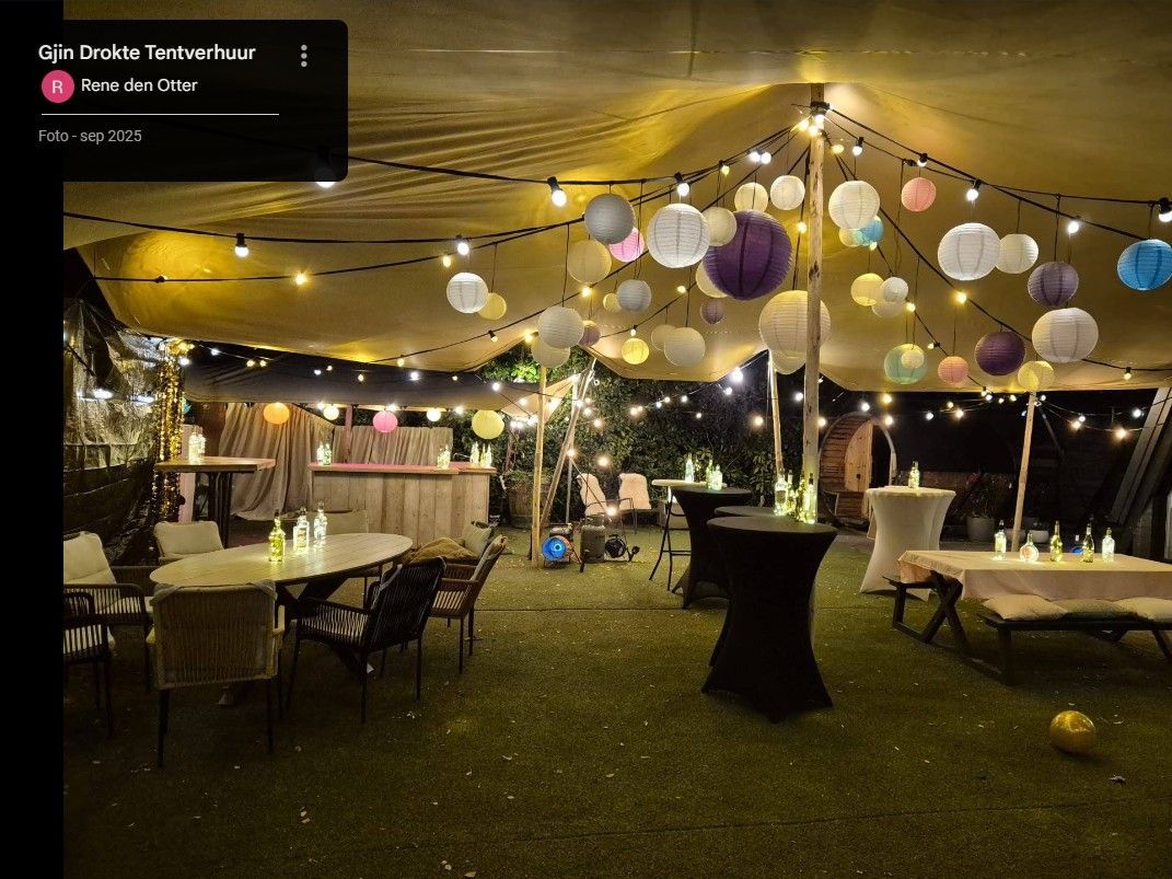 "Op zoek naar een 10mx10m stretchtent kwamen we terecht bij Gjin Drokte, waar we direct vriendelijk werden geholpen aan de telefoon. Communicatie over de prijs en de levering was duidelijk en ze doen wat ze zeggen. Samen met Klaas-Jan de tent opgezet, wat leerzaam en echt een deel van de voorpret was. We hebben het versierd en zo een geweldig feest gehad onder een hele mooie en sfeervolle tent! Ophalen was 'gjin drokte' voor ons, want dat werd soepel en snel door ze gedaan. Ofwel: we raden ze zeker aan!"